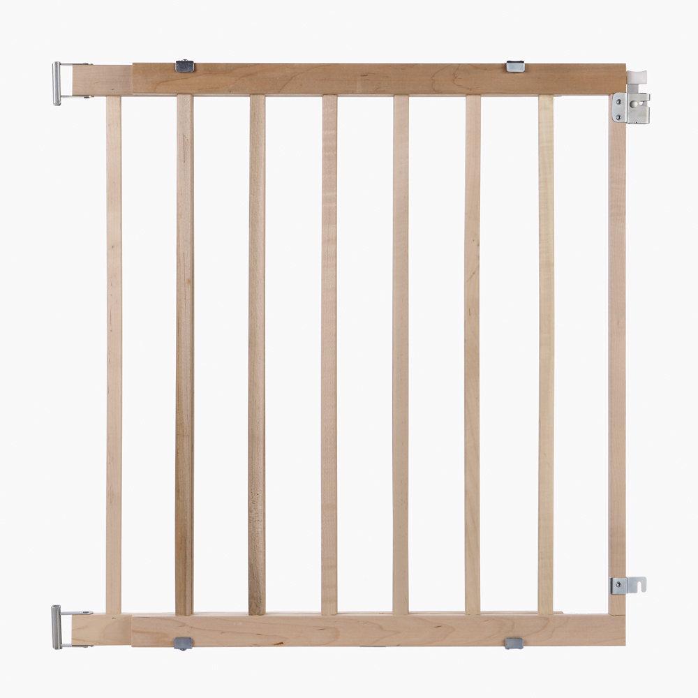 Swings in, out or both ways with swing control hinge. Childproof latch with easy one hand operation. Removes easily from hardware mount when not in use.