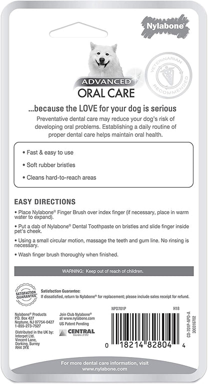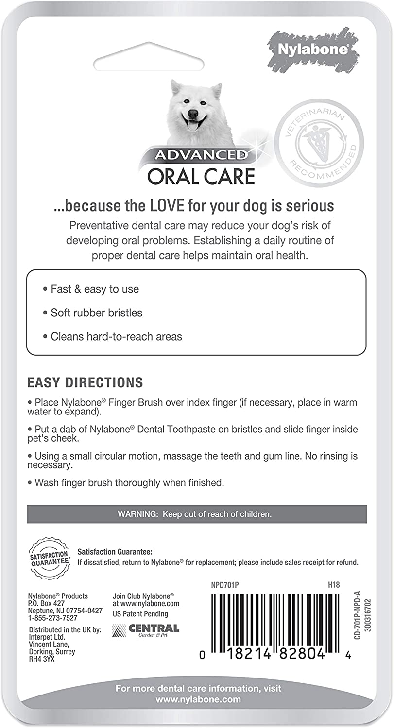 Preventative dental care reduces the risk of developing oral disease, which can lead to serious issues for dogs. Establishing a daily routine of proper dental care may extend the life of your pet. The veterinarian-recommended Nylabone Advanced Oral Care Finger Brush makes cleaning your dog's teeth easier. The brush slips onto your finger, so you can easily access hard-to-reach areas where plaque and tartar like to hide, and the soft rubber bristles gently reduce plaque and tartar buildup.