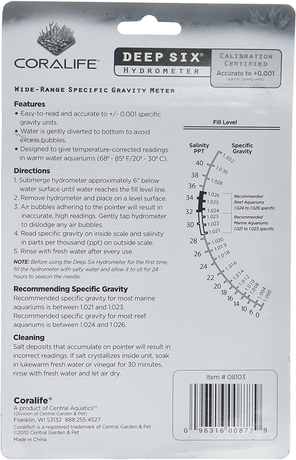 With its durable construction and easy-to-read scales, the Deep Six is guaranteed to provide years of reliable performance. Designed to give temperature-corrected readings in warm water aquariums, readings can be read in ppt and specific gravity. The Deep Six is accurate to +/- 0.001 specific gravity.