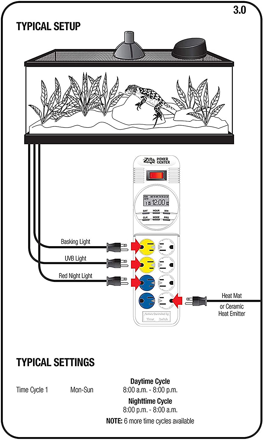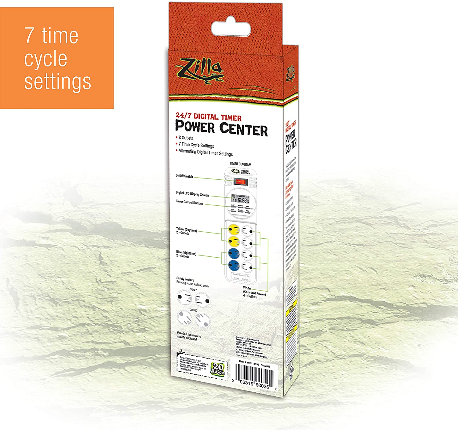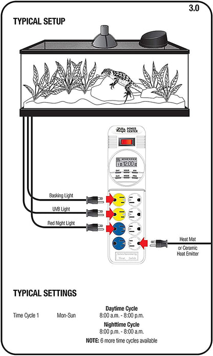 With minute-by-minute accuracy, this digital power center centralizes the control of lights, filters and heaters for a healthier reptile habitat. Simple fingertip controls make it easy to set a week of on/off schedule to mimic a sun cycle for light and heat. Control four devices at one time, while allowing four others to run constantly. Digital design includes a large central lcd readout, plus internal controls with fewer mechanical components to break down. This ruggedly built, ul listed device comes with a 12-month manufacturer warranty