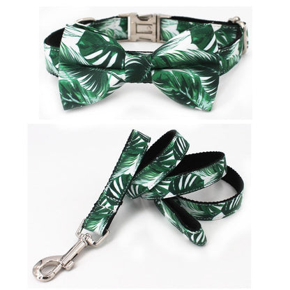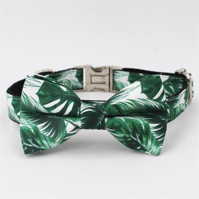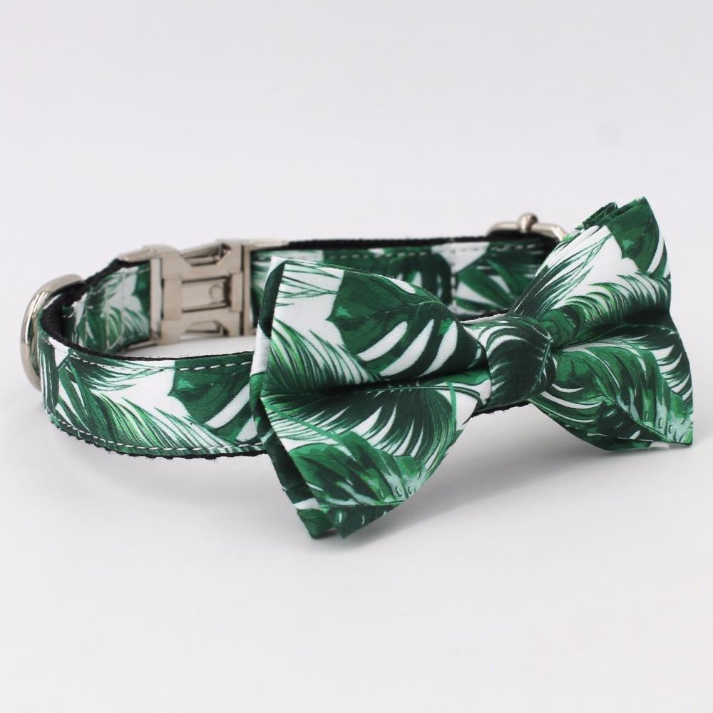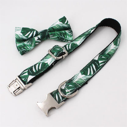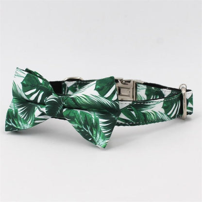 Your pet will be the life of the party with this jungle inspired dog collar. Our Jungle Mixer Collar and Bow tie features a double bow tie and durable hardware. The bow tie is attached via an elastic strap that is easy to put on and take off.