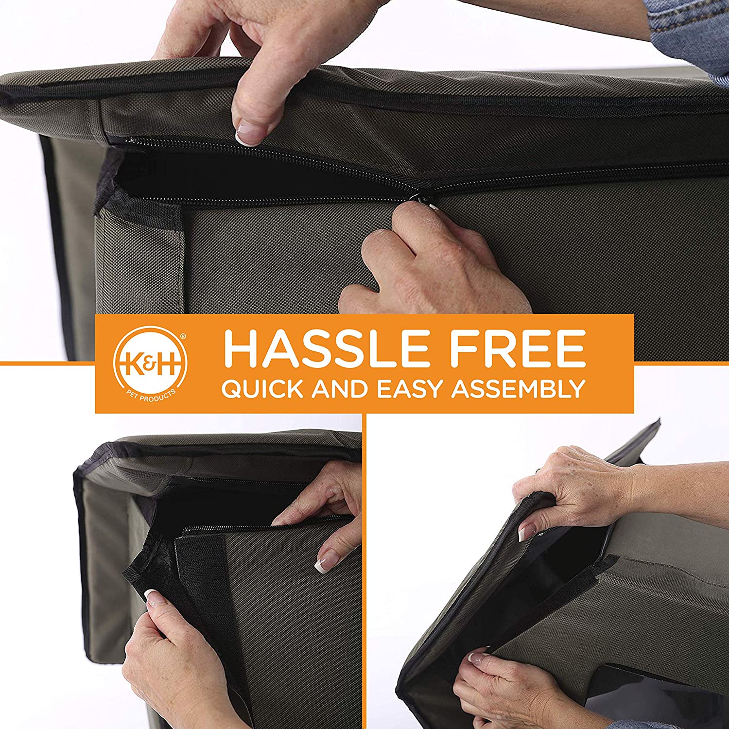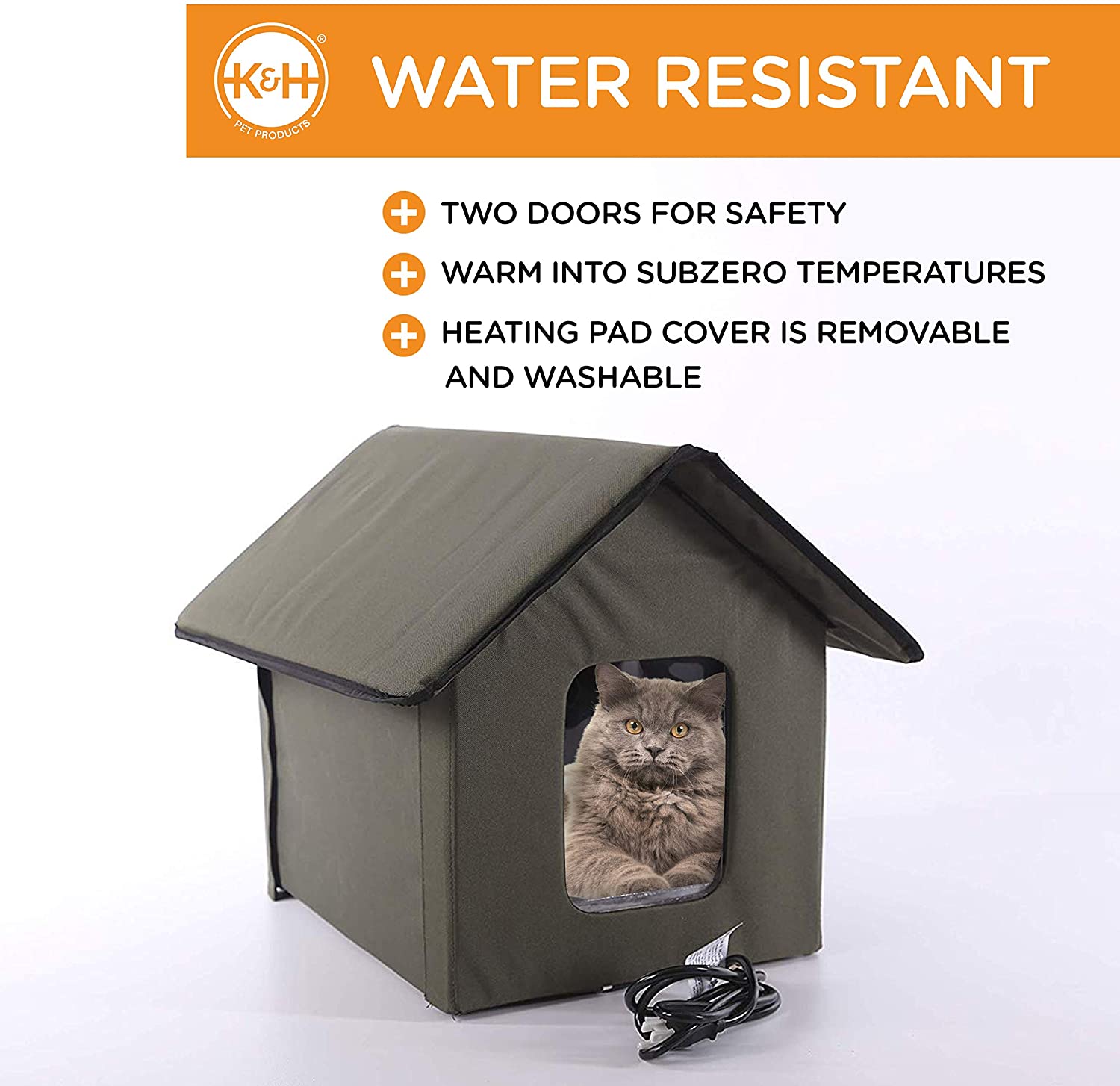 This house comes with and accommodates a Kitty Lectro-Soft. The roof hangs over the 2 doors to keep cats warm, safe and dry. Easy to assemble with hook and loop fastener walls and a zippered roof. MET listed. All K&H heated products are thermostatically controlled to heat to 102° F, regardless of the size. Dual thermostat simply means there are two internal thermostats that will keep the surface of the bed at 10-15° F above ambient air temperature when your pet is not on the bed. When your pet lies on the bed, it will warm to about 102° F.