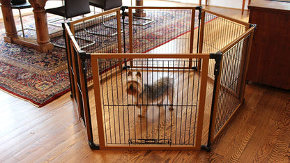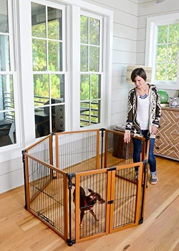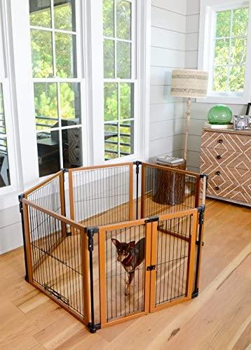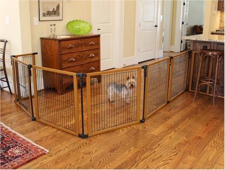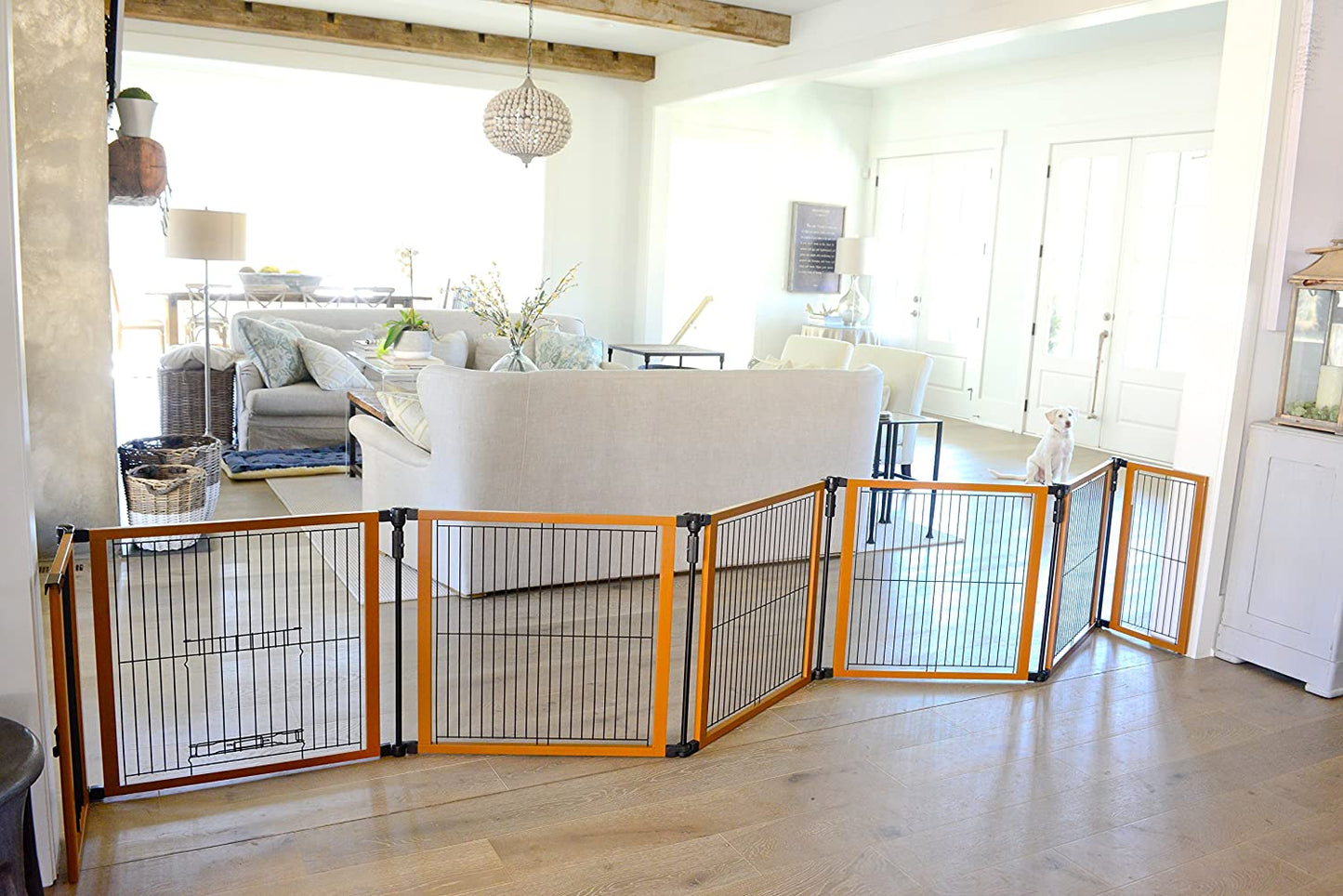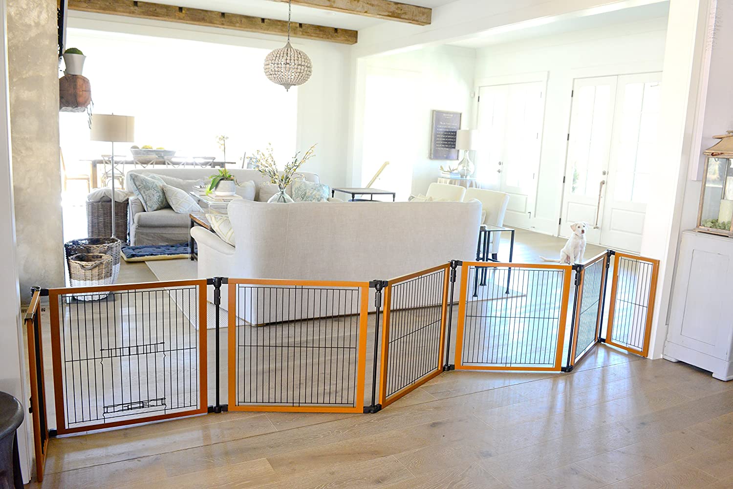 The Perfect Pet Gate is completely portable so you can use it where you need to. And this is no ordinary pet gate. You can also use it as a pet pen or play yard. This six panel get offer flexible configuration options and the built in puppy door allows easy access to your pet.